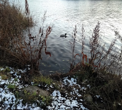 Tittar på anden som är den enda vinterbadaren inom synhåll denna dag när minusgraderna behållit greppet och snön som föll under natten faktiskt ligger kvar.